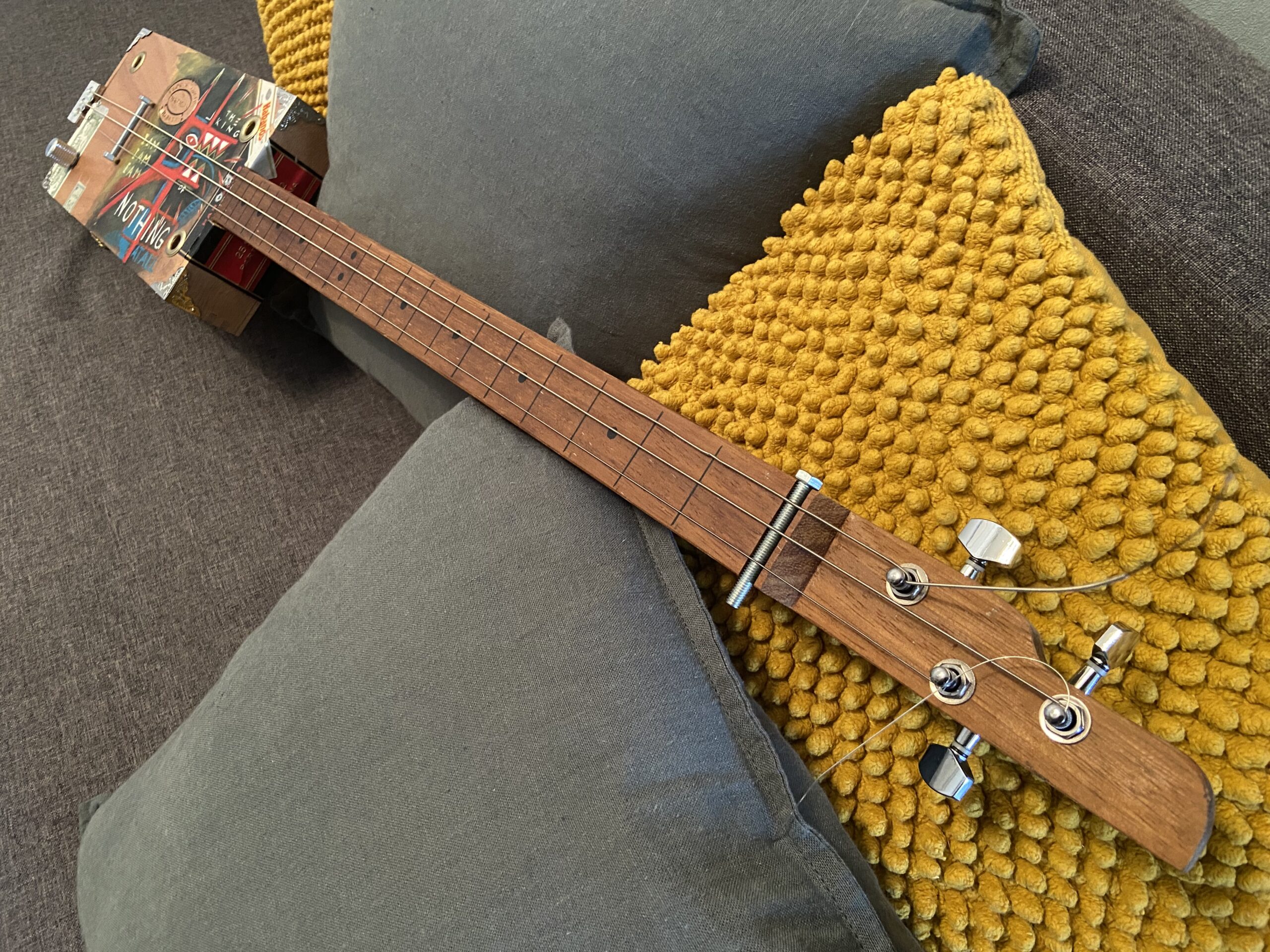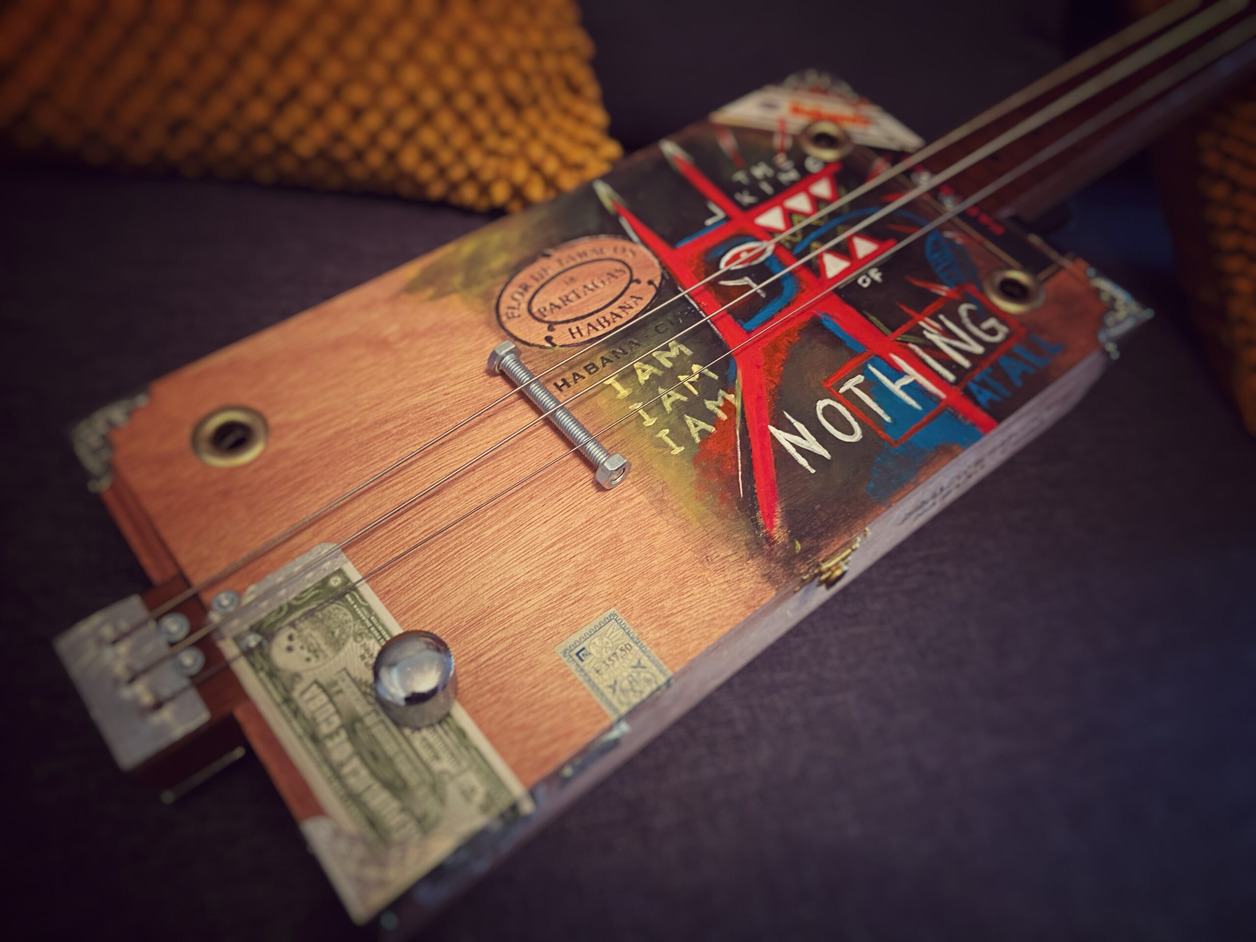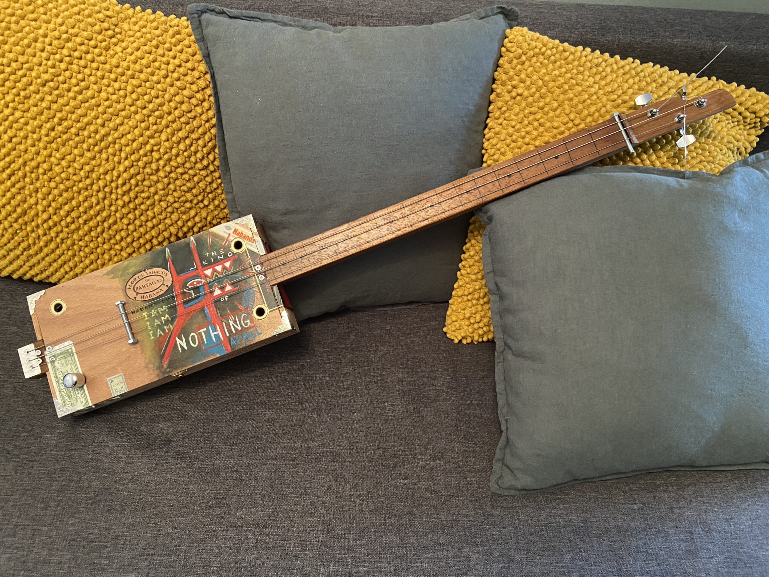 Gebaseerd op het schilderij ‘I am the king’ een elektrische drie-snarige cigarboxgitaar. oftewel a ‘poormans guitar’.